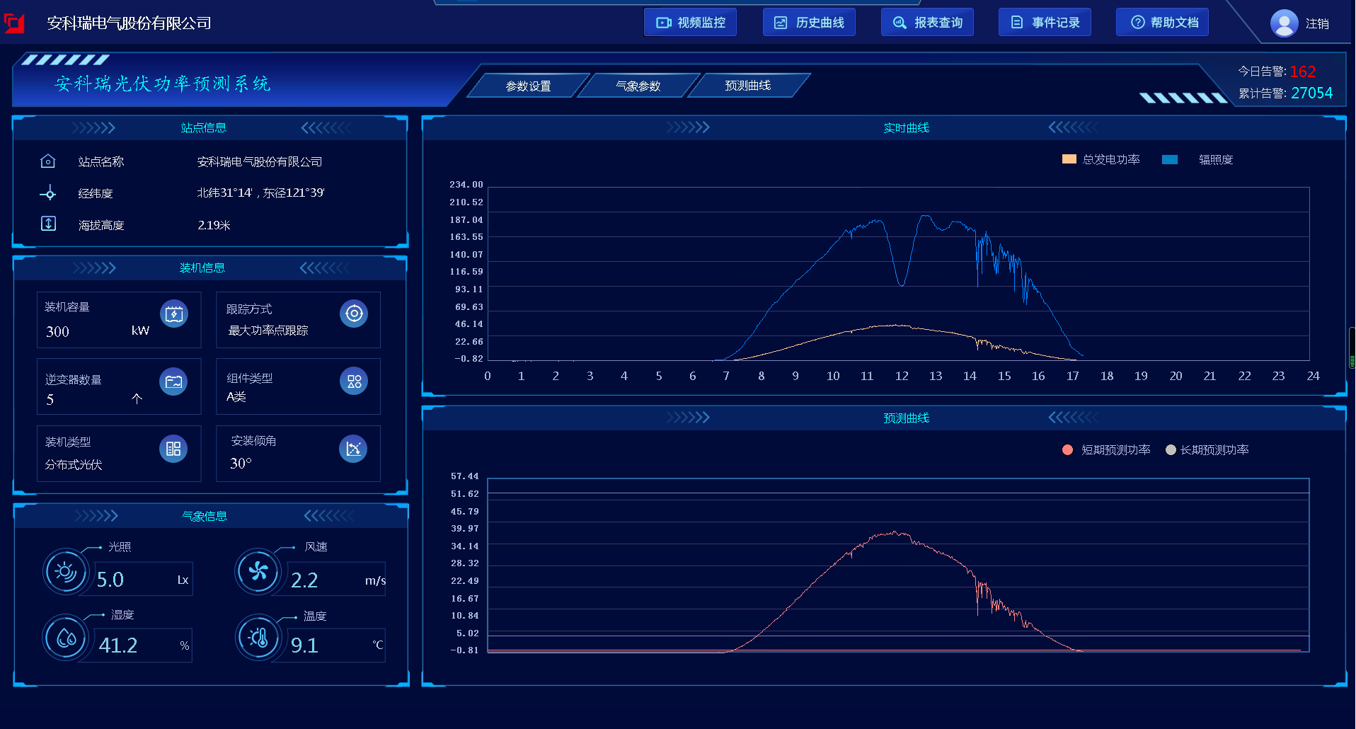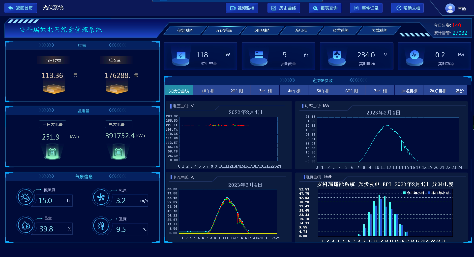 本界面用来展示对光伏系统信息,主要包括逆变器直流侧、交流侧运行状态监测及报警、逆变器及电站发电量统计及分析、并网柜电力监测及发电量统计、电站发电量年有效利用小时数统计、发电收益统计、碳减排统计、辐照度/风力/环境温湿度监测、发电功率模拟及效率分析;同时对系统的总功率、电压电流及各个逆变器的运行数据进行展示。