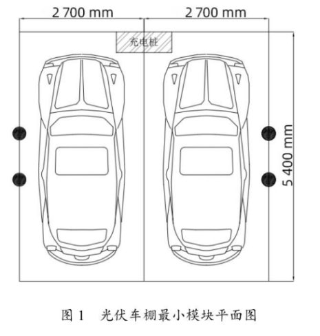 考虑到人流量、周边环境和学校日益增长的新能源汽车数量等因素,我们将该项目设置在某高校教学楼附近的停车场,以满足学校新能源汽车的充电需求。该处遮挡物较少且较为空旷,能使光伏车棚大化地发挥作用,提高太阳能的利用率,同时车棚还有遮挡太阳直射,保护车辆免受雨雪天气影响等作用,从而延长汽车使用寿命。根据我国《汽车库建筑设计规范》(JGJ100一98)规定,设计一个汽车的停车位长为5.4m、宽为2.7m,每排放10辆车,共两排,总长54m,能一次性满足20辆小汽车同时停放和充电需求,并且每个小模块左右分别设置两根圆形支撑柱(在图1中用小圆点表示),以保持光伏车棚结构的稳定性和安全性,如图1所示。