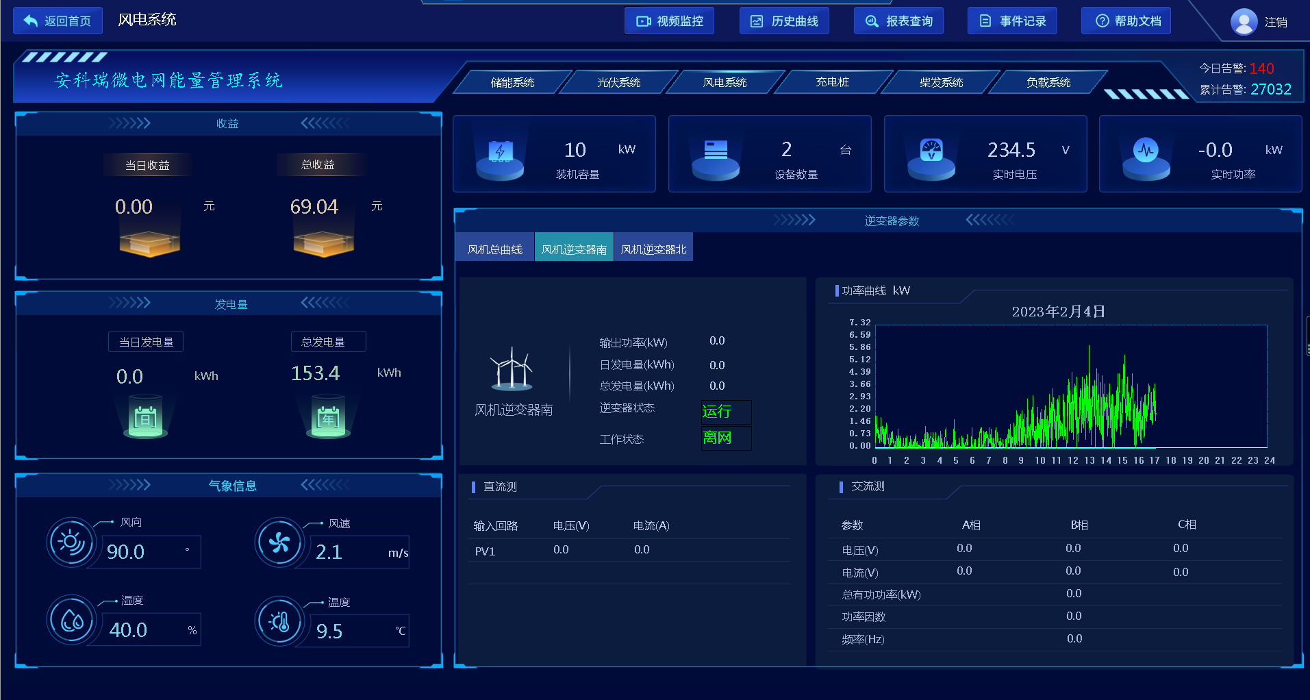 本界面用来展示对风电系统信息,主要包括逆变控制一体机直流侧、交流侧运行状态监测及报警、逆变器及电站发电量统计及分析、电站发电量年有效利用小时数统计、发电收益统计、碳减排统计、风速/风力/环境温湿度监测、发电功率模拟及效率分析;同时对系统的总功率、电压电流及各个逆变器的运行数据进行展示。
