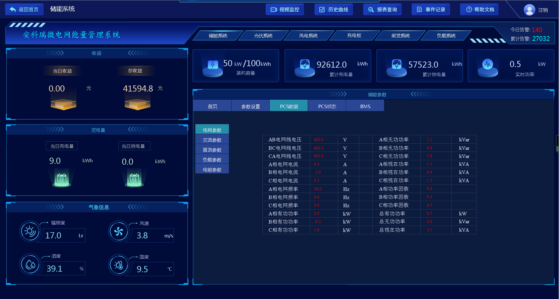 本界面用来展示对PCS交流侧数据,主要包括相电压、电流、功率、频率、功率因数、温度值等。同时针对交流侧的异常信息进行告警。