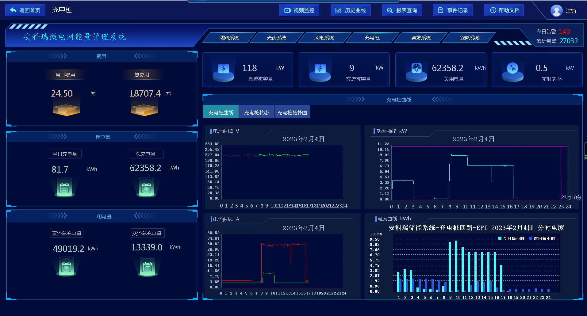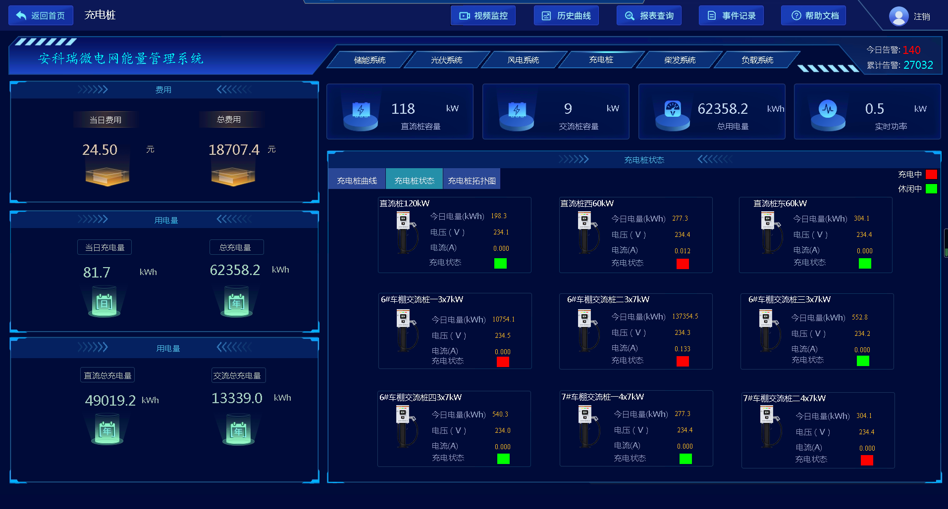 本界面用来展示对充电站系统信息,主要包括充电站用电总功率、交直流充电站的功率、电量、电量费用,变化曲线、各个充电站的运行数据等。