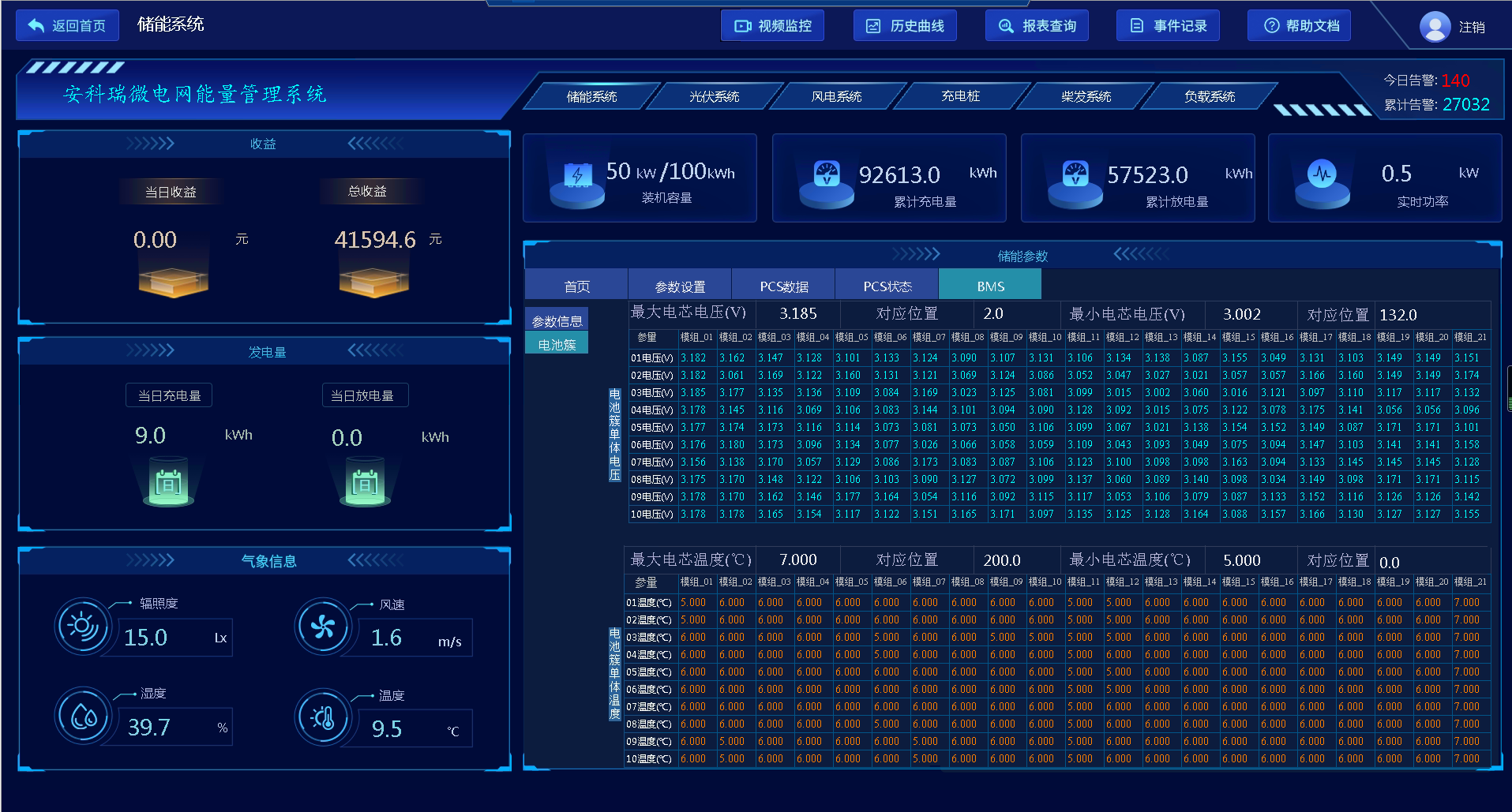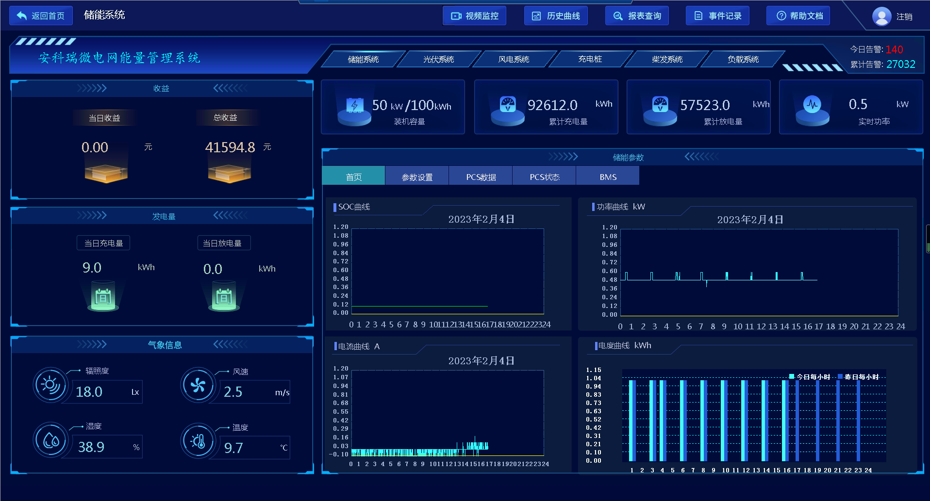 应能够对遥信变位,保护动作、事故跳闸,以及电压、电流、功率、功率因数、电芯温度(锂离子电池)、压力(液流电池)、光照、风速、气压越限等事件记录进行存储和管理,方便用户对系统事件和报警进行历史追溯,查询统计、事故分析。